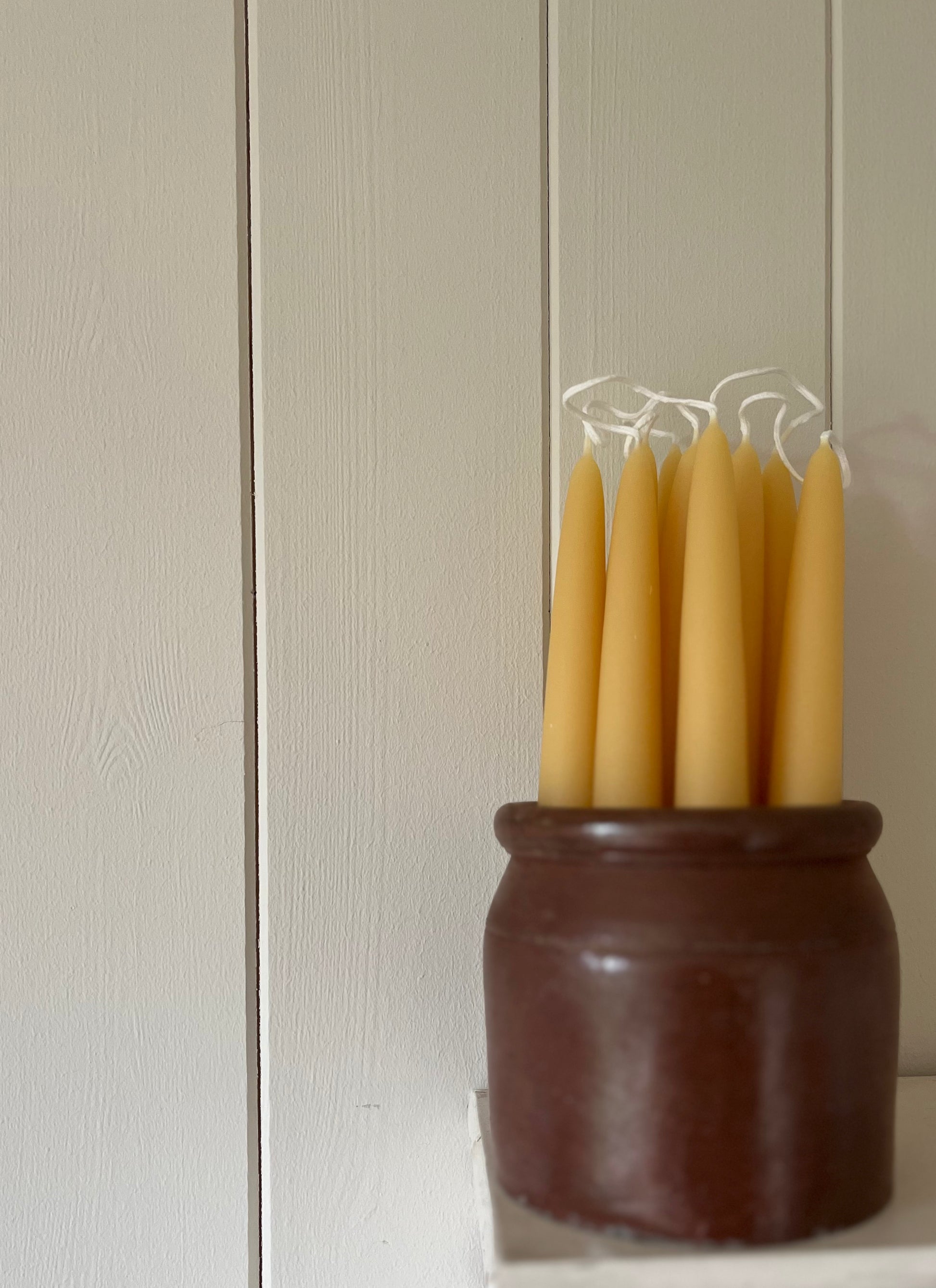 Our beeswax candles are hand-dipped in Cumbria and come joined in pairs. They are standard dinner candle size (23cm high), with an approximate 8 hour burning time.