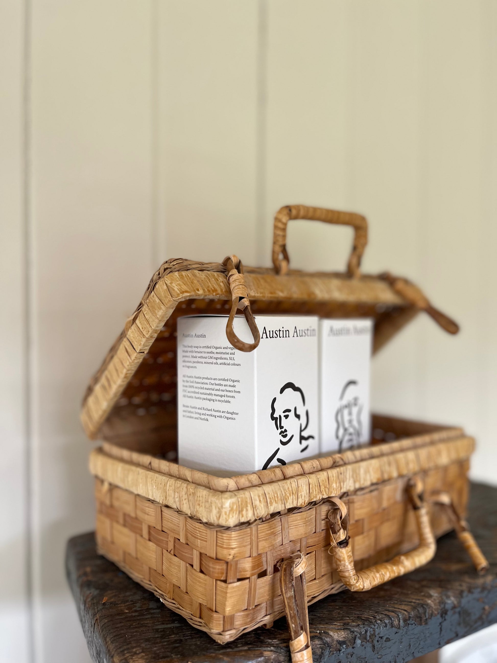 The cutest little wicker hamper/suitcase. It would.make a very sweet gift or Christmas Eve box, or just for small storage in the house. Lots of possibilities! The Austin Austin and Santa products are there for inspiration and scale, sadly not included :)