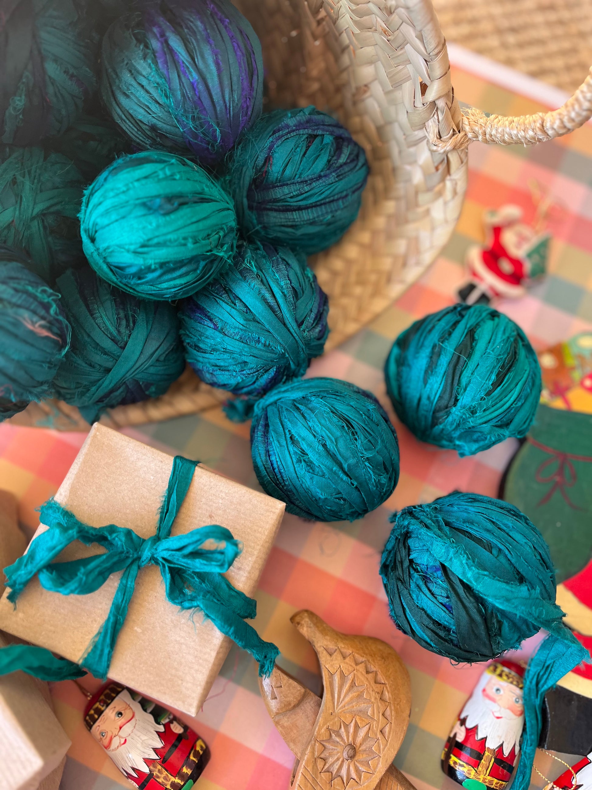 Our ribbons are made from recycled silk saris in Northern India. The saris are dyed, cut into strips, and then stitched together (and sometimes tied), to form one continuous length. They make for beautiful gift wrapping, flower arranging, weddings, or anything you can think of that is in need of a bow! The edges of the ribbon are raw, and due to the nature of the silk coming from lots of different garments, the colours can slightly vary within each ball. But for us this only adds to the story. For a wider finish, you can also iron the silk flat.