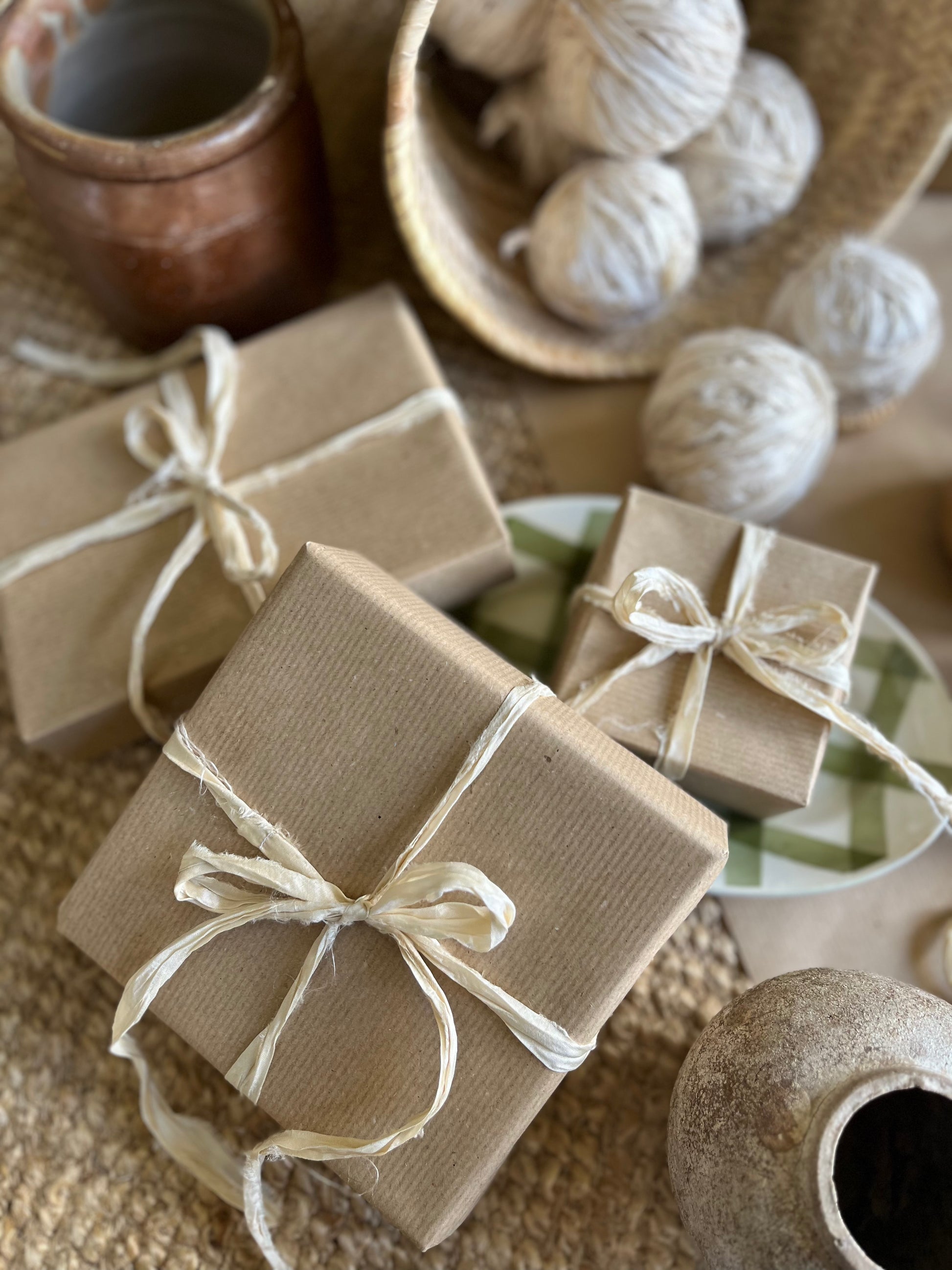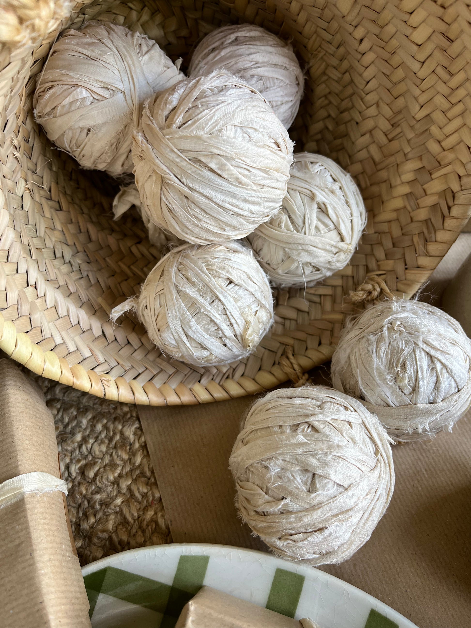 Our ribbons are made from recycled silk saris in Northern India. The saris are dyed, cut into strips, and then stitched together (and sometimes tied), to form one continuous length. They make for beautiful gift wrapping, flower arranging, weddings, or anything you can think of that is in need of a bow! The edges of the ribbon are raw, and due to the nature of the silk coming from lots of different garments, the colours can slightly vary within each ball. But for us this only adds to the story. For a wider finish, you can also iron the silk flat.