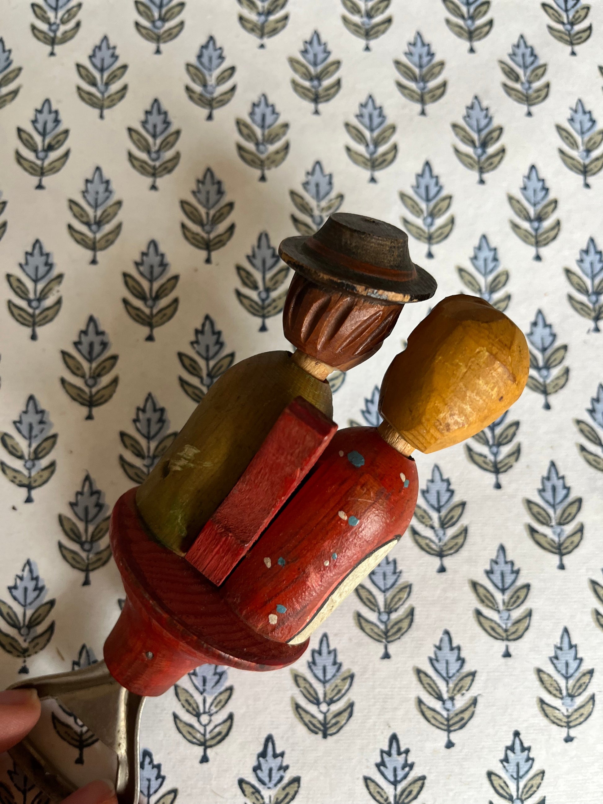 A charming vintage bottle opener where we believe originally the couple were meant to kiss when the lever was pulled. The lever still allows them to move, but perhaps not as much as a full on smooch - or maybe very British about kissing in public? Still a wonderful piece to have in your bottle opening weaponry.