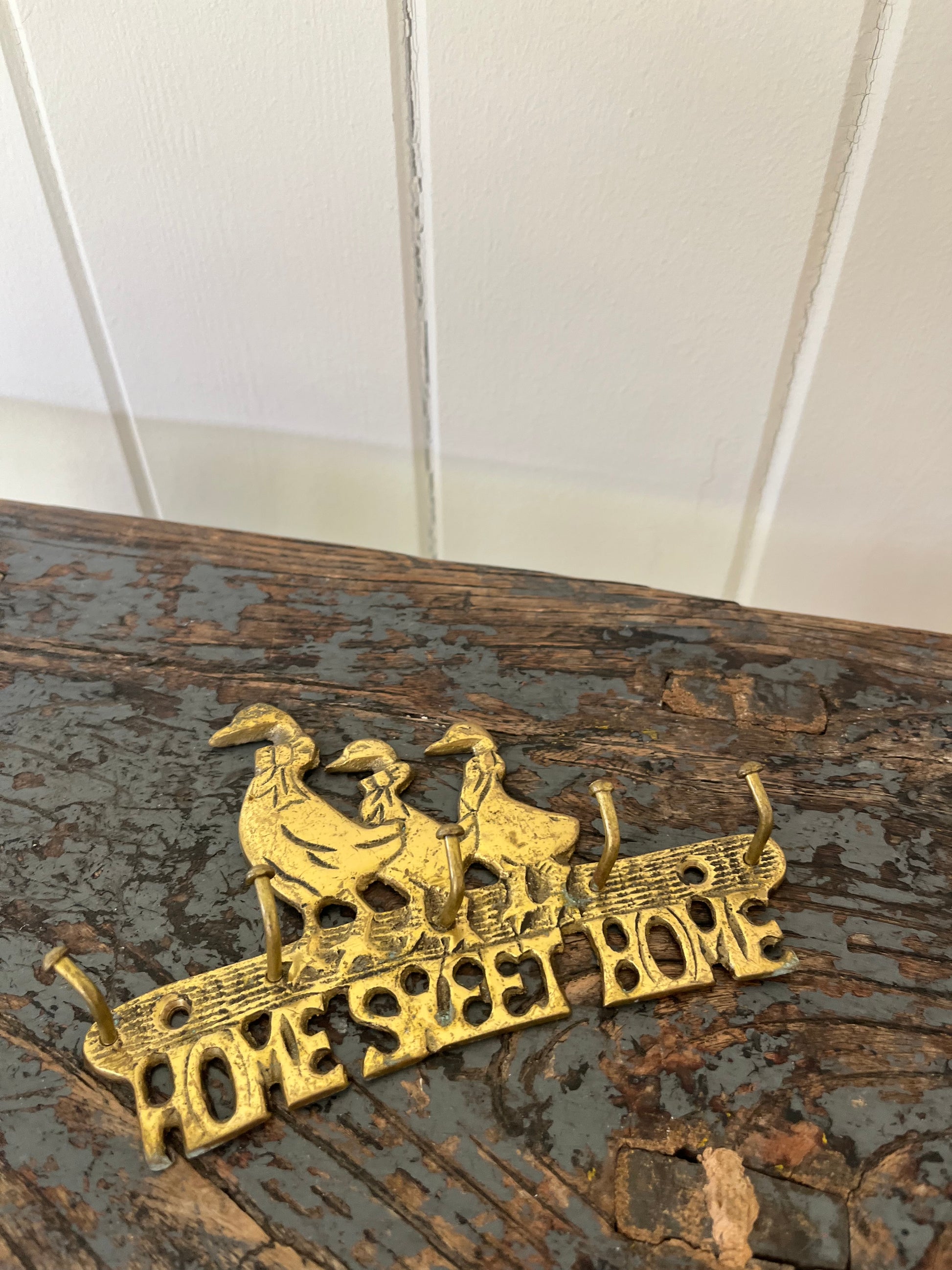 A very sweet little set of brass hooks with geese. There are two holes within the piece to allow you to screw it on to the wall.