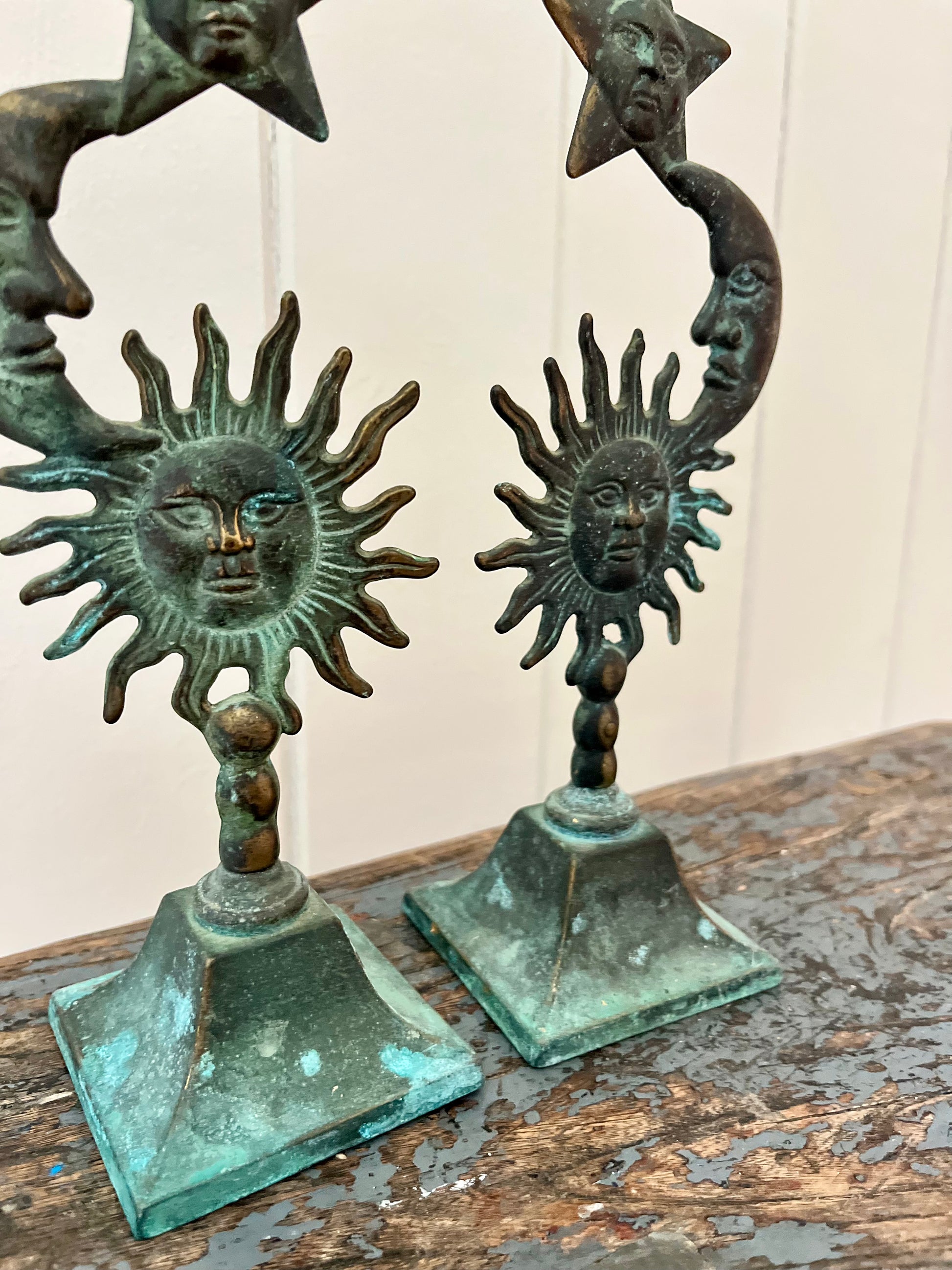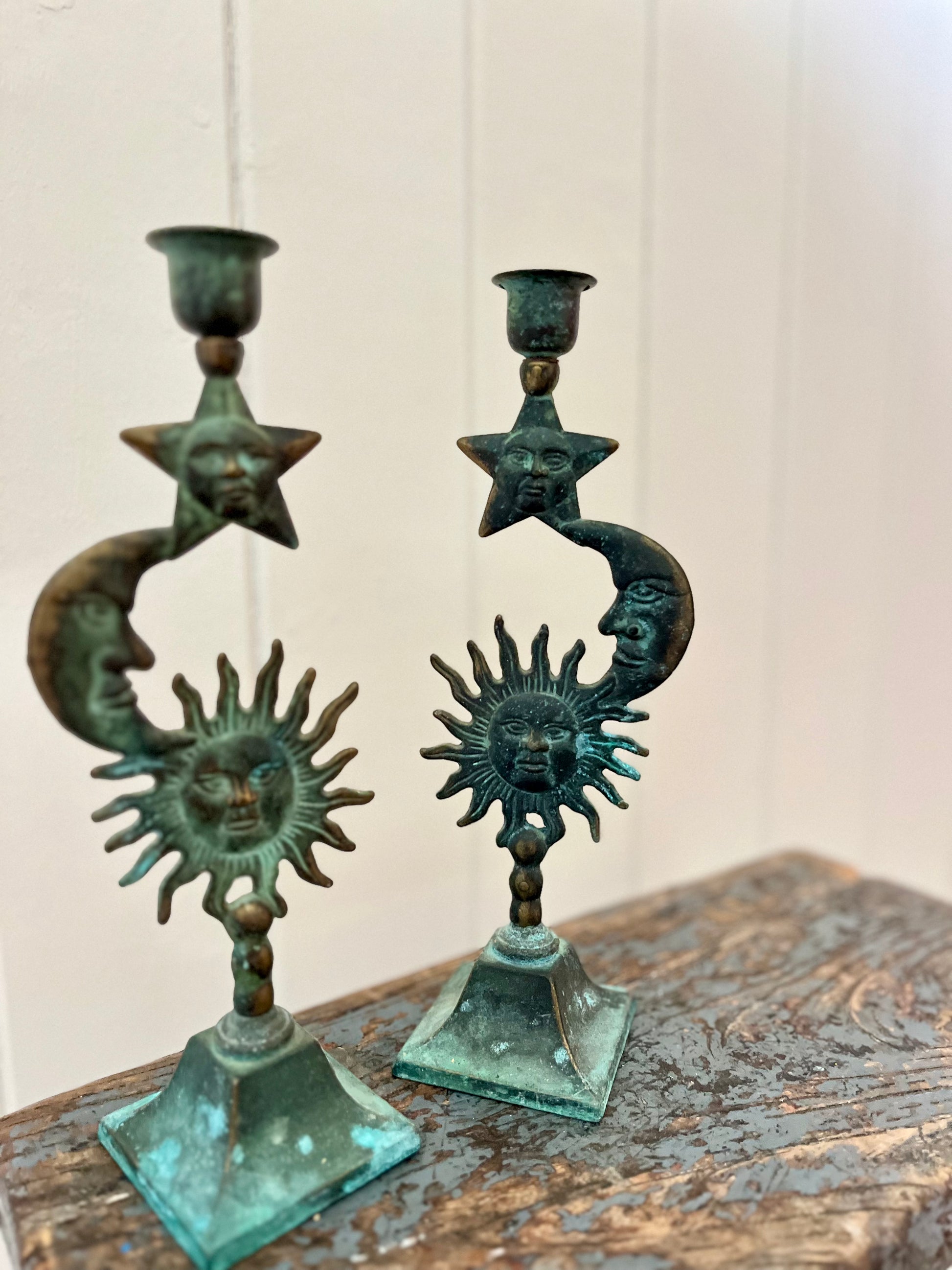 A pair of brass candlestick holders, dating from the 1990s. Wonderful patina to these and each one measures 26cm high. They fit our beeswax dinner candles perfectly.