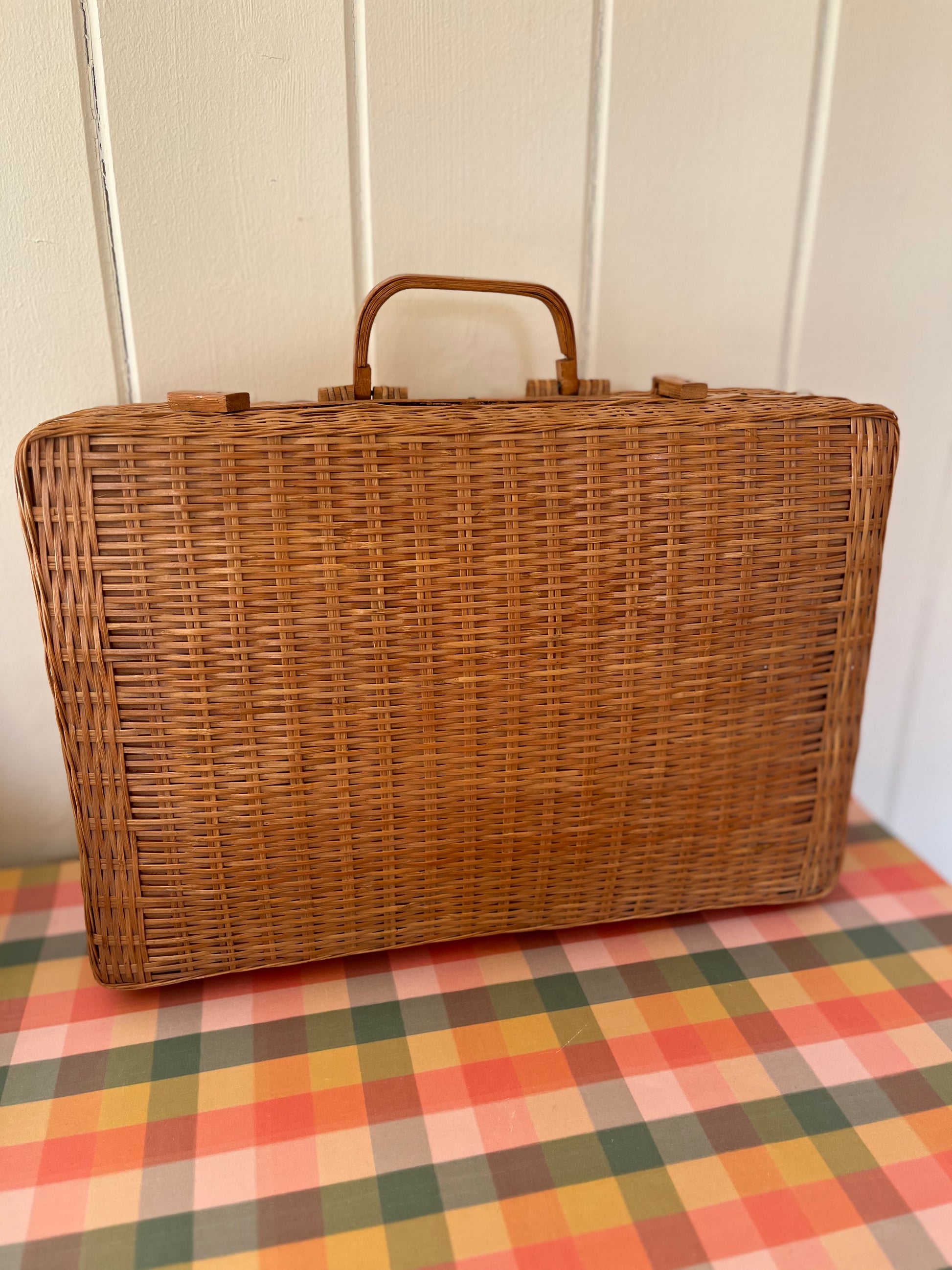 A lovely vintage wicker suitcase. It would.make a very sweet gift or Christmas Eve box, or just for small storage in the house. Lots of possibilities! The products are there for inspiration and scale, sadly not included :)