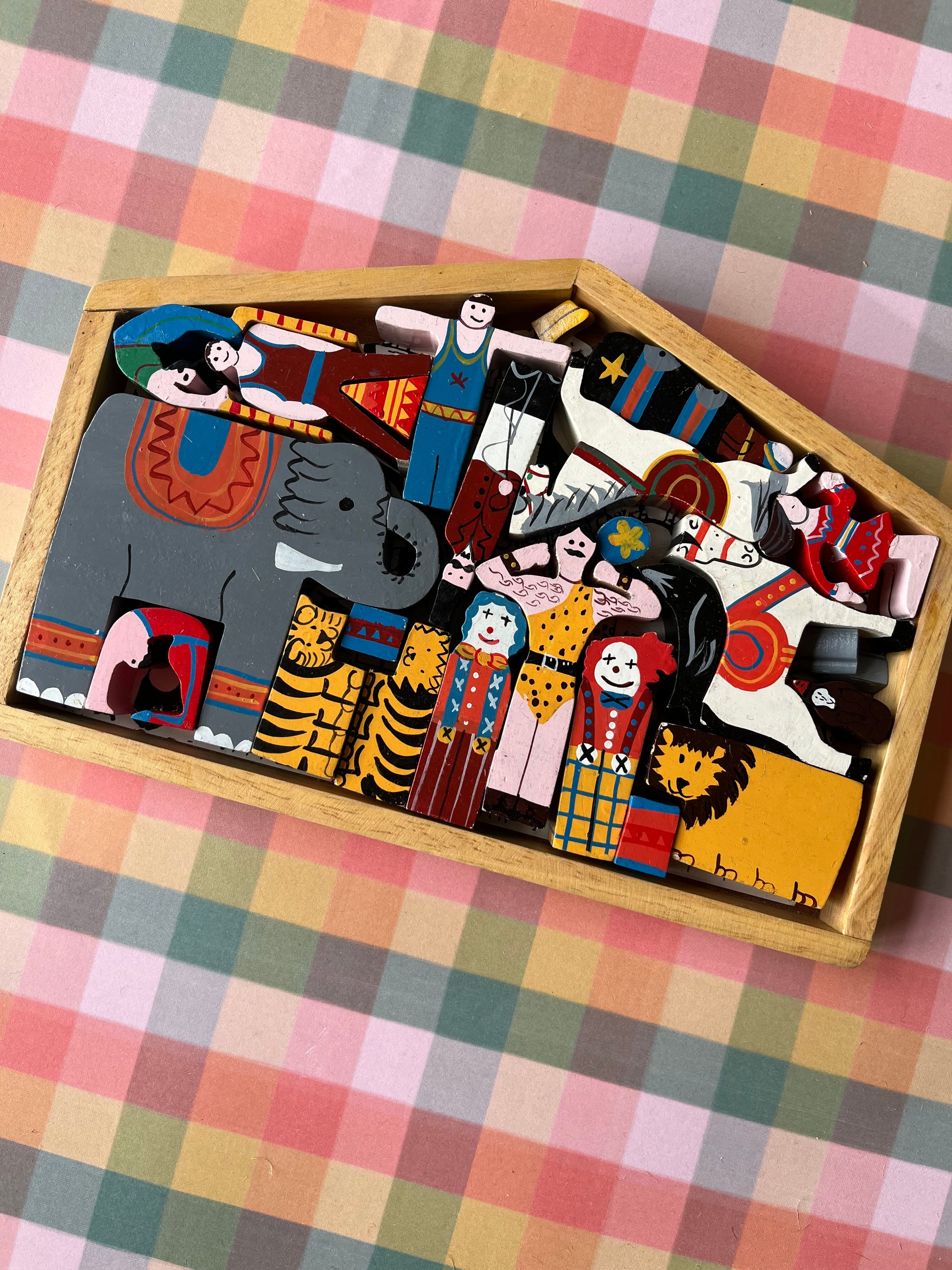 A joyful vintage puzzle made up of wooden circus figurines. We believe these are Sri Lankan made. There is a piece missing at the very very top, but otherwise in lovely vintage condition and would make for wonderful tiny displays if you separate the characters from the tray.