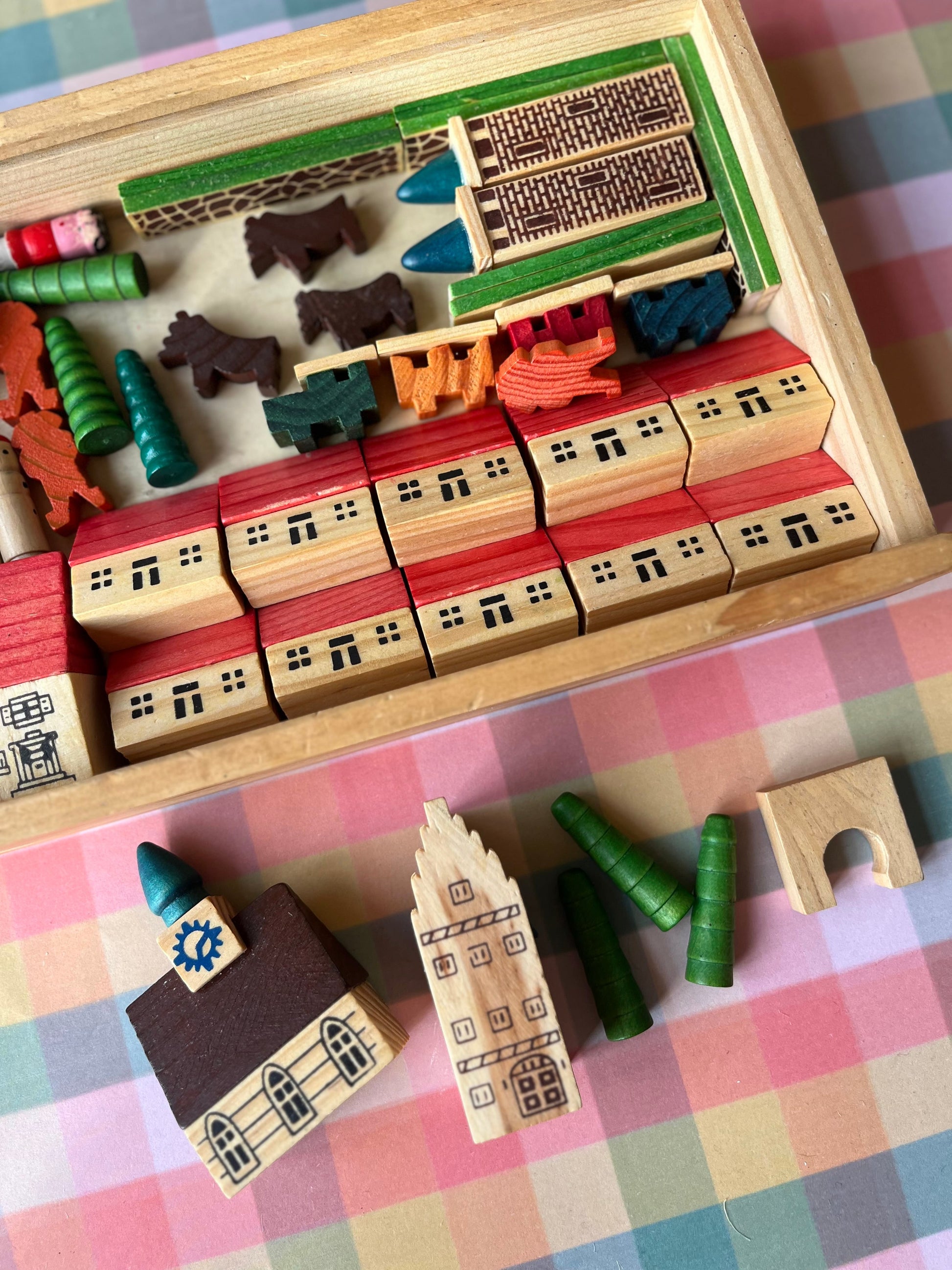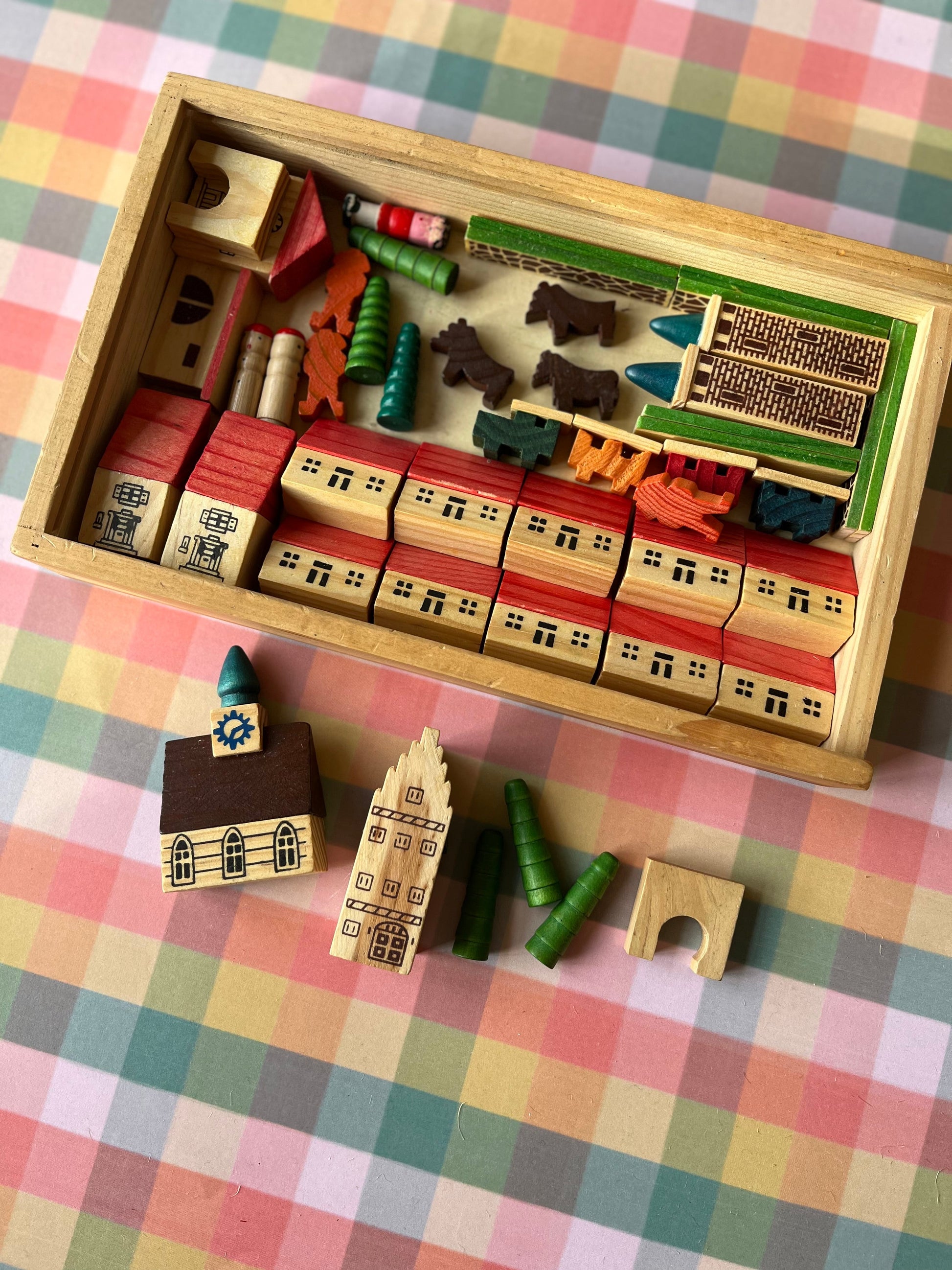 A vintage wooden village set, all pieces complete in their box. Lots of joy to be had making little scenes.